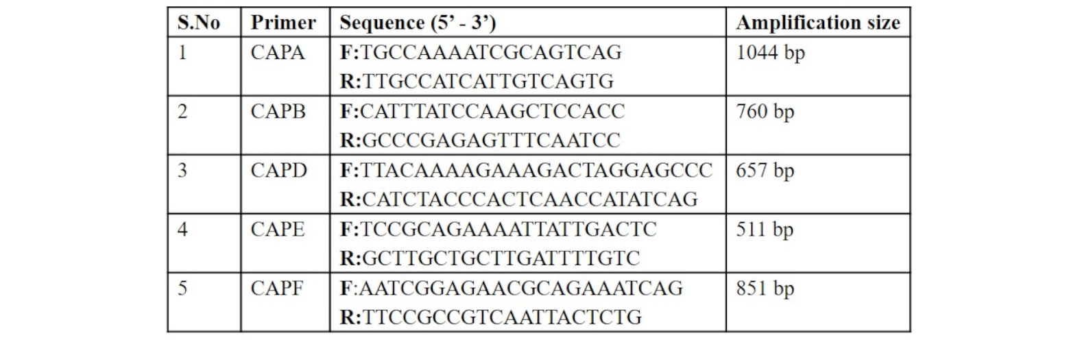 The isolates were further confirmed by amplification of KMT1 gene P. multocida using oligonucleotide primers KMT1T7 (5’-ATCCGCTATTTACCCAGTGG-3’) and KMT1SP6 (5’-GCTGTAAACGAACTCGCCAC-3’) as per the method described (Townsend et al. 1998). Multiplex PCR for capsular typing using CAPA, CAPB, CAPD, CAPE and CAPF primers for amplification of hyaD-hyaC, bcbD, dcbF, ecbJ and fcbD genes respectively, was done as described Townsend et al. 2001. The protocol for PM-PCR and multiplex capsular PCR was as follows, Initial denaturation at 94°C for 5 min, followed by 30 cycles, each cycle consisting of 3 steps- denaturation at 94oC for 30 sec, annealing at 50oC for 30 sec, Extension at 72oC for 60 sec. Final Extension was carried out at 72oC for 10 min. Details of the primers used for capsular PCR were listed in (Table I).