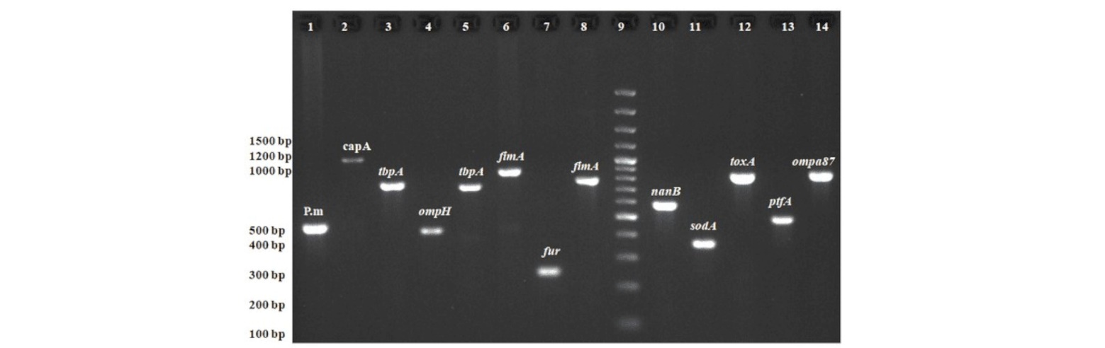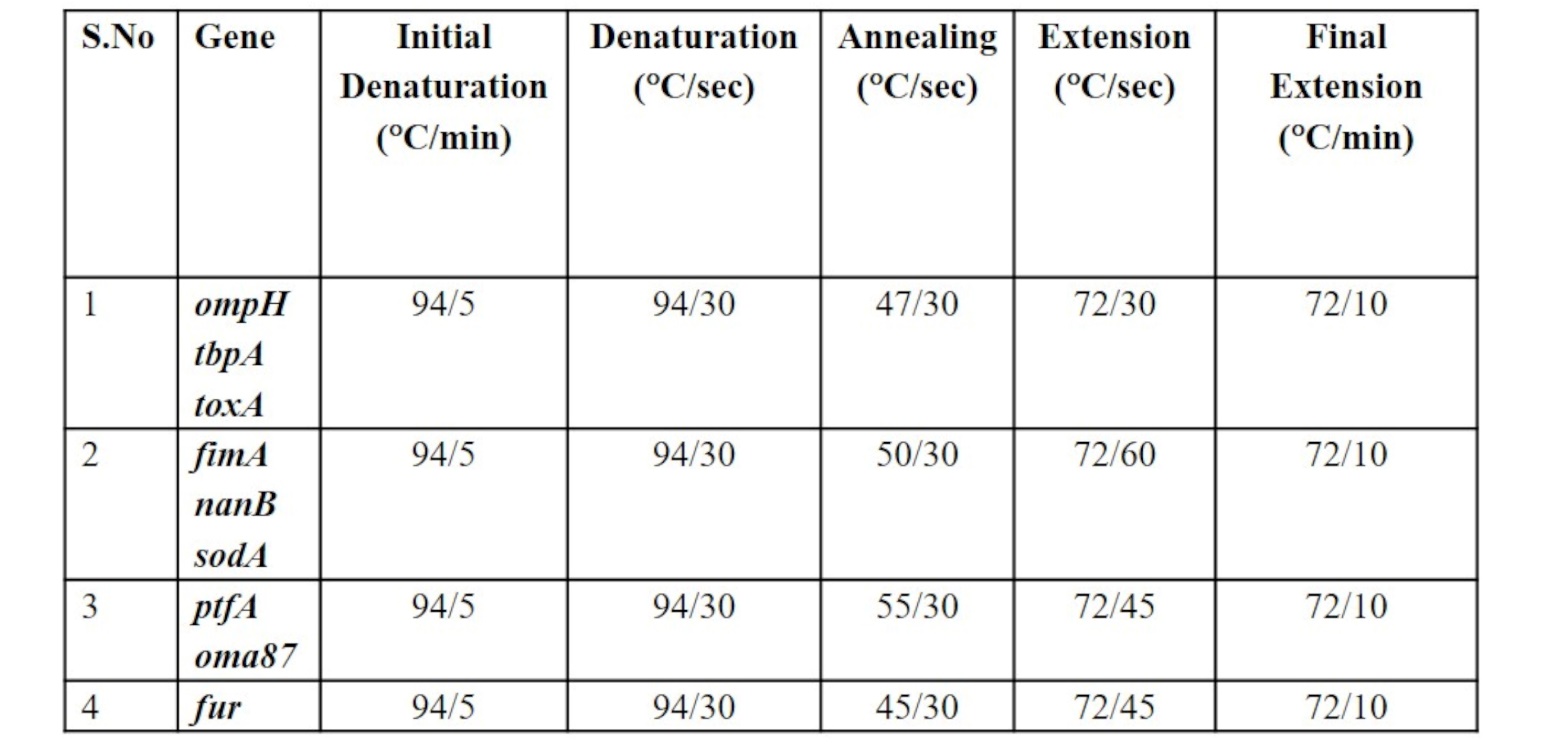 A total of 9 virulence associated genes (ompH, tbpA, toxA, fimA, nanB, sodA, oma87, ptfA and fur) were targeted using multiplex PCR. First multiplex PCR was carried out for ompH, tbpA and toxA genes, second multiplex PCR for fimA, nanB and sodA genes, duplex PCR for ptfA and oma87 genes while fur was amplified in a separate reaction. The primer sequences used for multiplex PCR and protocol for amplification of genes were listed in (Table II and III) respectively.