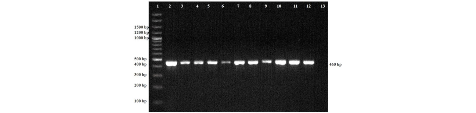 Figura. 1. PM-PCR for detection of KMT gene of P. multocida. Lane 1: 100 bp DNA ladder, Lane 2: Positive control (P. multocida ATCC 12945), Lane 13: No template control, Lanes 3-12: P. multocida isolates showing 460 bp amplicon.