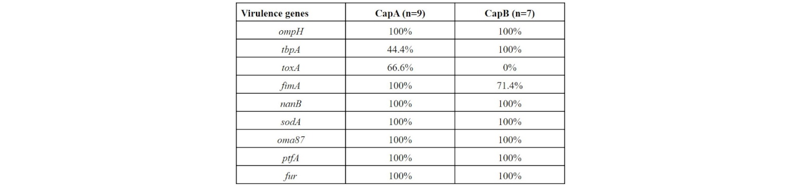 Table. V. Prevalence of virulence genes among different capsular types of P. multocida isolates.