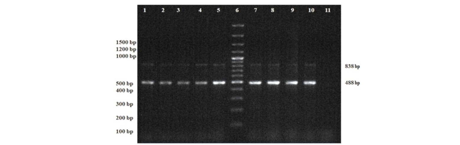Figure. 5. Duplex PCR for detection of ptfA and oma87 genes of P. multocida. Lane 6: 100 bp DNA ladder, Lane 11: No template control, Lanes 1-5 and 7-10: Isolates positive for ptfA (488 bp) and oma87 (838 bp).