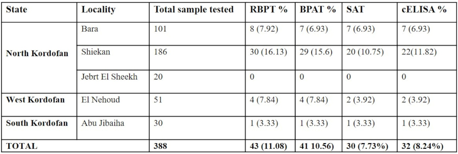 Due to the limited information available about brucellosis in camels and the lack of epidemiological data, this study aims to determine the occurrence, best diagnostic serological tests, and spread of brucellosis in camels in the Kordofan States of Western Sudan. To achieve these objectives, various serological tests used for brucellosis diagnosis in camels namely the Buffered Plate Agglutination Test (BPAT), modified Rose Bengal Plate Test (mRBPT), Serum Agglutination Test (SAT), and competitive Enzyme linkimmunosorbent Assay (cELISA) have been mapped and evaluated.