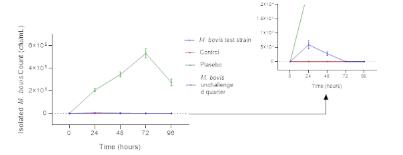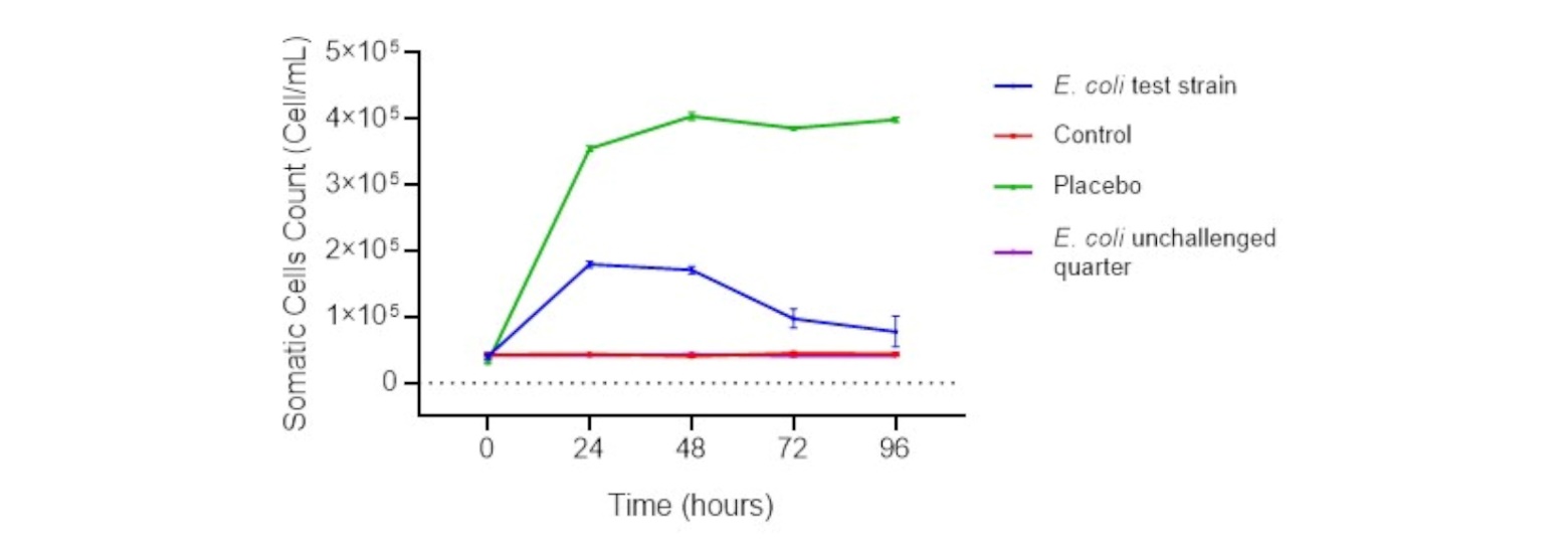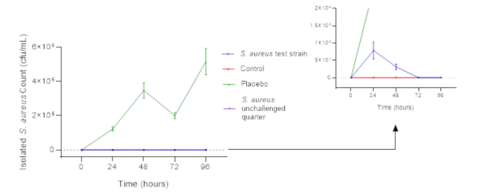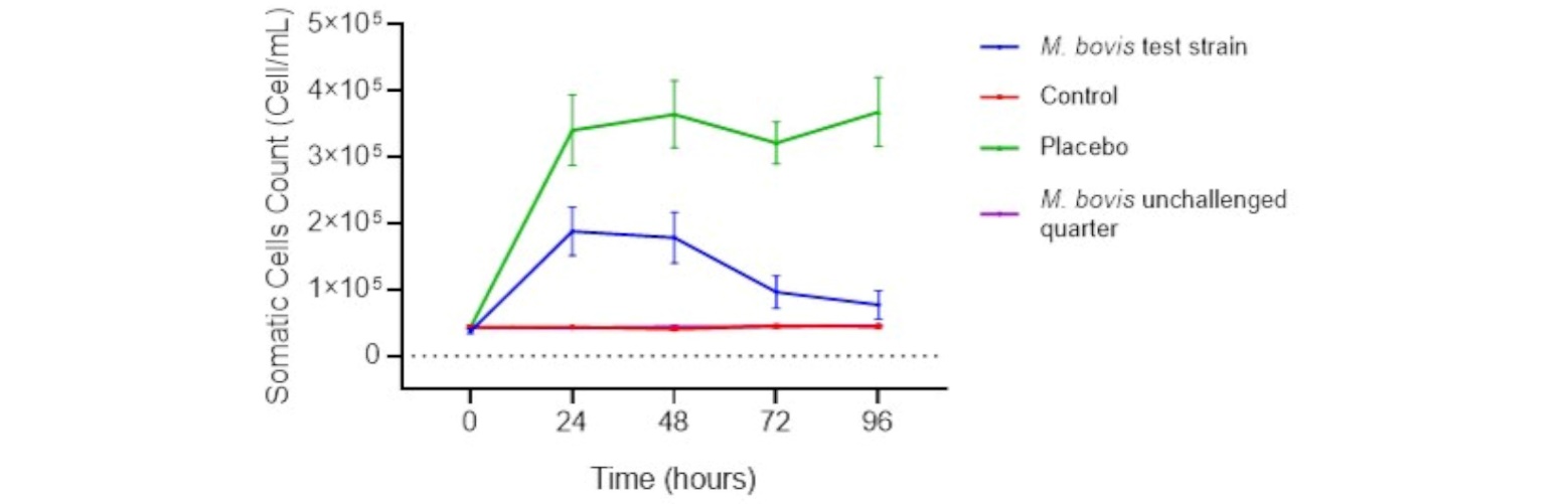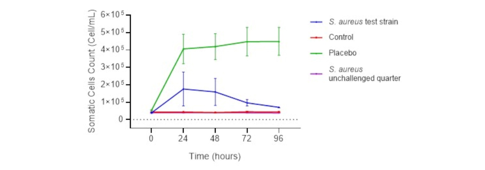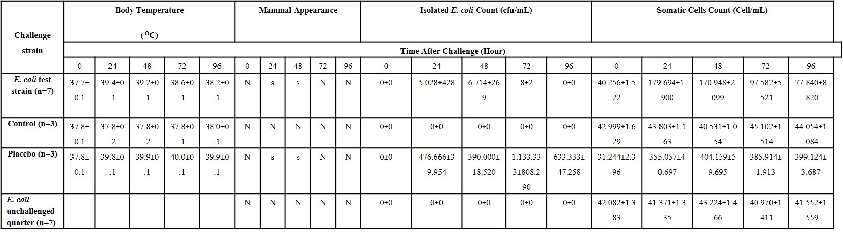 Parameters examined in animals after the pathogenicity study were rectal temperature, appearance of milk, bacterial count in milk samples, somatic cell count, and general clinical signs.