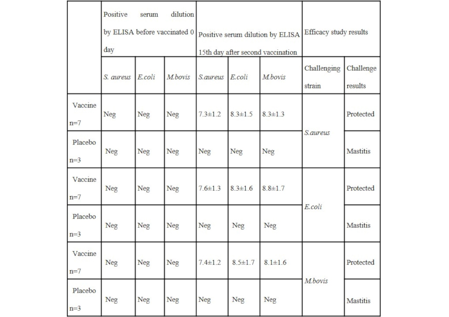 Table. IV. Antibody values in serum of combined mastitis vaccine vaccinated and unvaccinated placebo heifers.