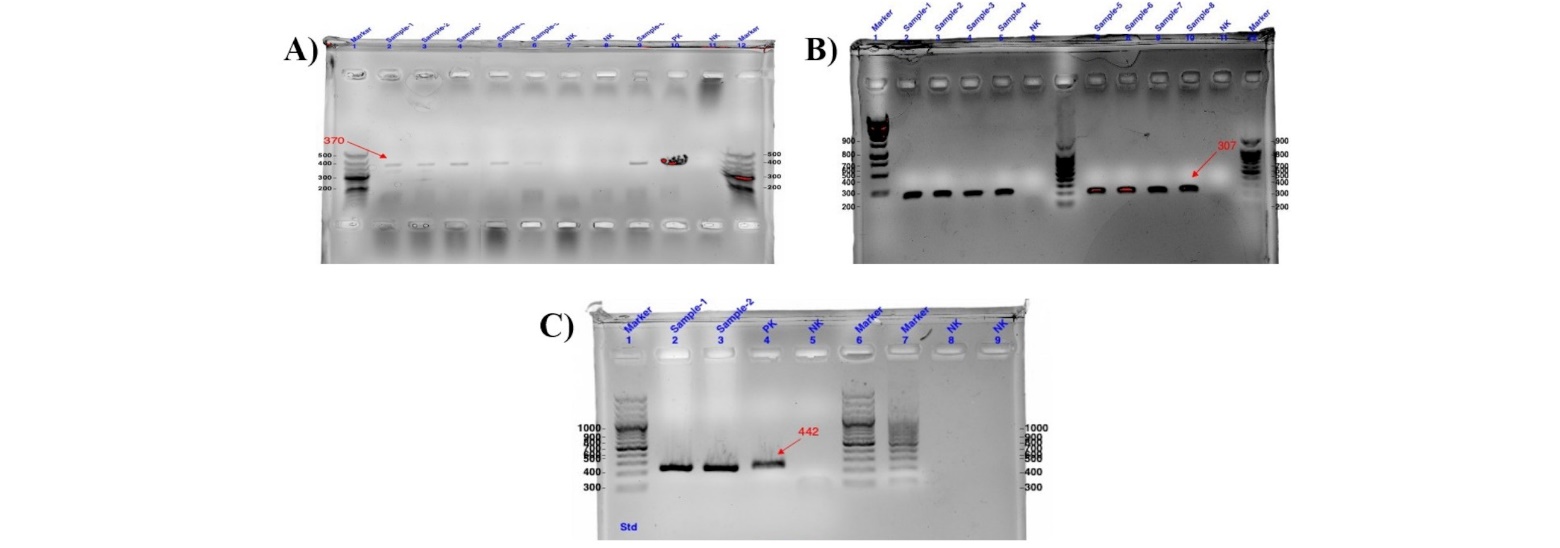 S. aureus specific bands in the collected samples were detected at 370 bp against the DNA loaders, while no bands were detected in the negative samples as well negative control electrophoresis results are demonstrated in the figure 1A. E. coli TraT gen specific bands in the collected samples were detected at 307 bp against the DNA loaders, while no bands were detected in the negative samples as well negative control electrophoresis results are demonstrated in the figure 1B. M. bovis PpSM5 specific bands in the collected samples were detected at 442 bp against the DNA loaders, while no bands were detected in the negative samples as well negative control electrophoresis results are demonstrated in the figure 1C.