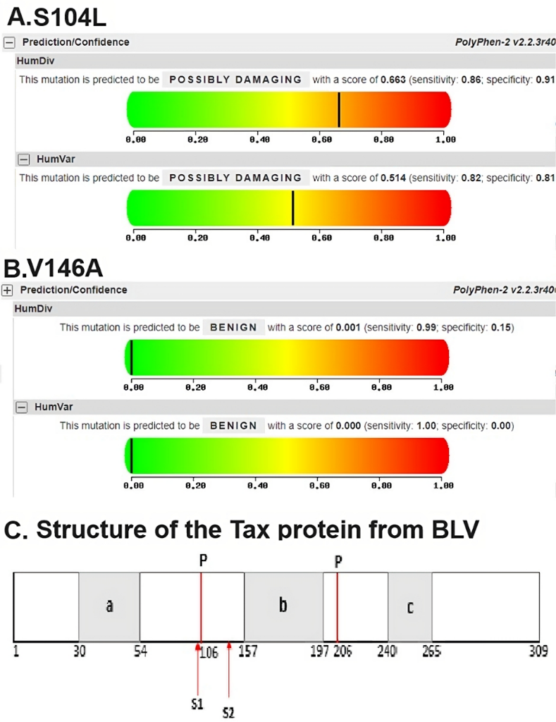 Figure. 5. Mutant protein sequences of the BLV tax gene and the Tax protein structure diagram using the PolyPhen-2 mutation analysis. A. Mutant S104L protein sequence, B. Mutant V146A protein sequence, and C. Tax protein structure diagram. a: amino-terminal zinc finger, b: leucine-rich activation domain, c: multifunctional domain, P: phosphorylation site, S1: S104L amino acid substitution, S2: V146A amino acid substitution.