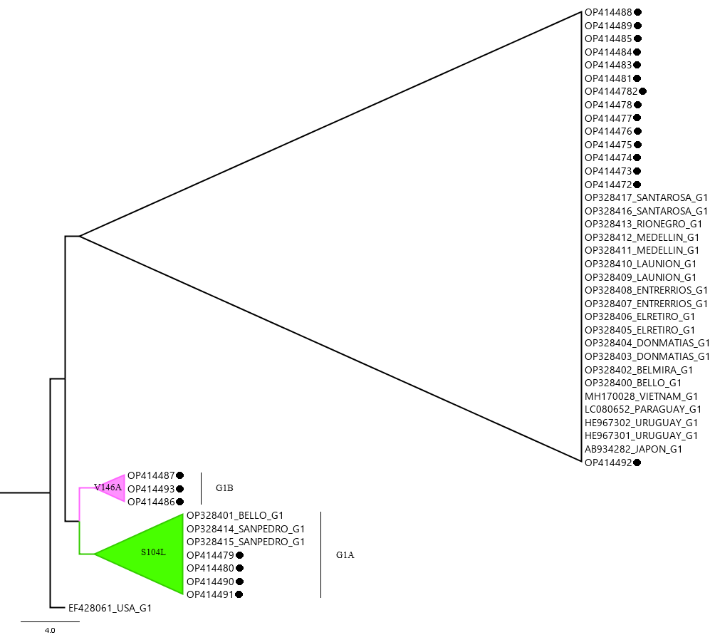 In both phylogenetic trees, two subclades of G1A and G1B are highlighted (Figures 2 and 3). The first highlighted in green has four sequences (OP414480, OP414490, OP414491, and OP414479) recorded in this study, along with three sequences obtained from the north and Valle de Aburrá areas of the Department of Antioquia (OP328415, OP328414, and OP328401) (Úsuga-Monroy et al. 2023). Therefore, it could be considered a new subtype of genotype 1 (G1A), considering branch supports of 87% obtained with the maximum likelihood and 100% with the Bayesian methods. The other subclade highlighted in pink locates three study samples (OP414439, OP414487, and OP414486) with branch supports of 85% obtained with the maximum likelihood and 86.92% with the Bayesian methods.