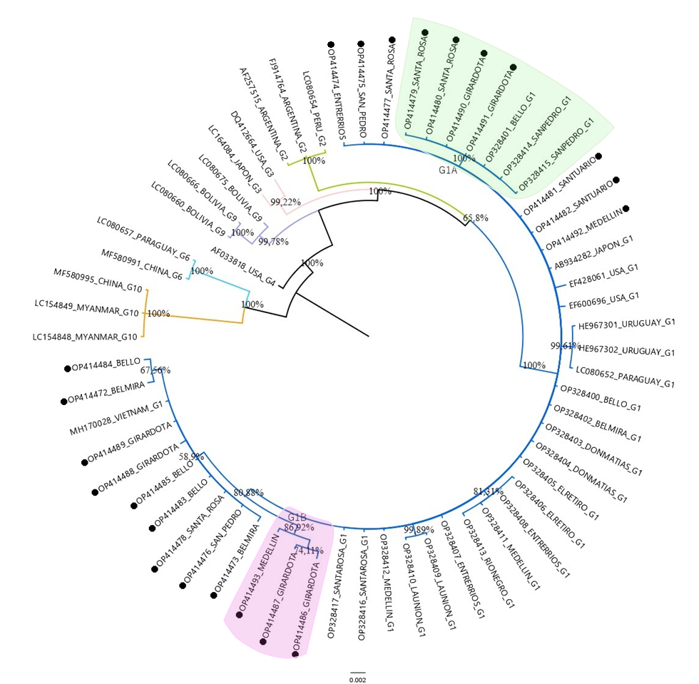 Figure. 2. Phylogenetic tree of the bovine leukemia virus (BLV) tax gene by the Maximum Likelihood method. The evolutionary history of the tax gene was reconstructed using the GTR+G+I model. Bootstrap values (1000 replicates) were plotted near the nodes. The tree is represented to scale where branch lengths are measured in the number of substitutions per site (Bar: 0.005 substitutions per site). The analysis was based on a combination of 39 partial sequences obtained from the GenBank database and 22 partial sequences isolated in the current study from three regions (north, east, and Valle de Aburrá) of the Department of Antioquia, Colombia, marked with (●). Genotypes (G) are indicated with numbers next to the sequence name, and clades are highlighted with different colors on the branches (blue G1, green G2, pink G3, sky blue G6, purple G9, orange G10, and black G4. Only one sequence is included). The data set used to build the tree consists of 843 positions. All evolutionary analyses were carried out using the MEGA X V.10.2.6 software.