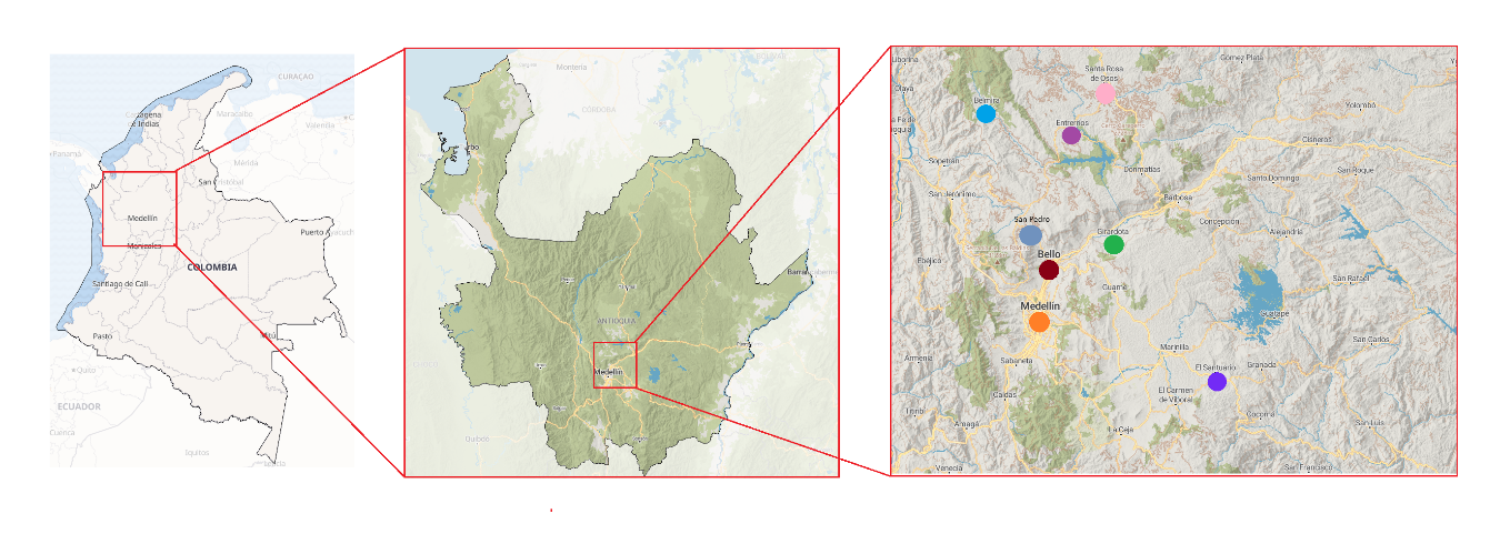 Figure. 1. Georeferencing of the samples of the Department of Antioquia, Colombia. The map represents the geographical location of the analyzed samples from three regions of Antioquia. North: the lilac dot represents the samples from San Pedro (2 positive samples out of 12); the purple dot represents the samples from Entrerrios (1 positive sample out of 6); the pink dot represents the samples from Santa Rosa (4 positive samples out of 19), and the blue dot represents the samples from Belmira (2 positive samples out of 8). Valle de Aburrá: the orange dot represents the samples from Medellín (2 positive samples out of 16); the brown dot represents the samples from Bello (3 positive samples out of 11); and the green dot represents the samples from Girardota (6 positive samples out of 10). East: the purple dot represents the samples from the el Santuario area (2 positive samples out of 4).