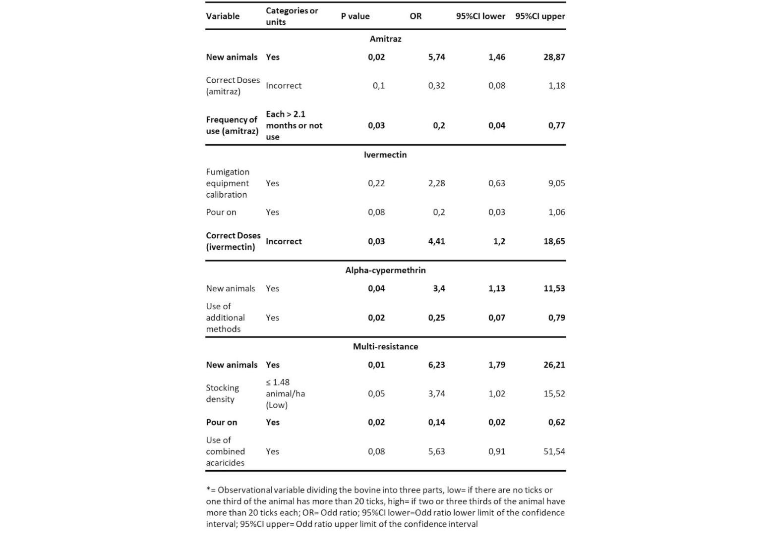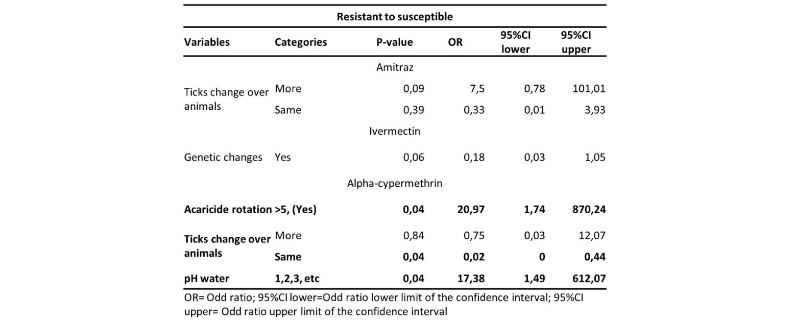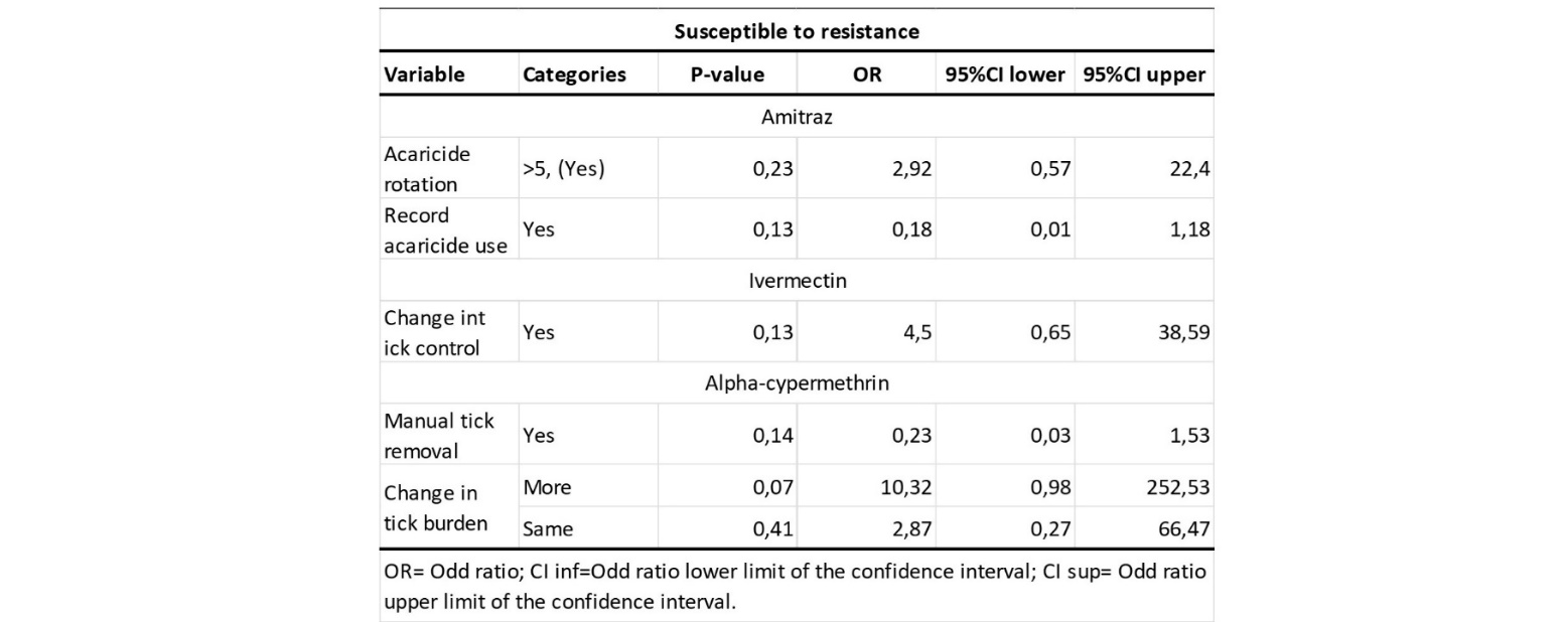Risk factors associated with acaricide resistance differed between zones. While (Rodríguez-Vivas et al., 2006) failed to identify any factors associated with resistance to similar acaricides, our findings emphasize that management variables identified as associated are significant and applicable regardless of the specific acaricide they were statistically linked to.