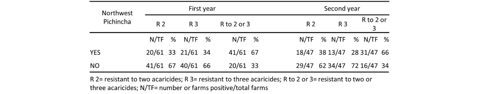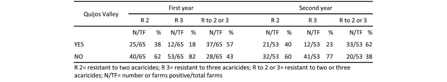 In the first year, 67.21% (41/61), 57.38% (35/61), and 67.21% (41/61) of farms in NP were resistant for amitraz, ivermectin, and alpha-cypermethrin, respectively. In QV, 61.54% (40/65), 43.08% (28/65), and 60% (39/65) were resistant to the same acaricides. In the second year, percentages of resistant farms were 59.45% (28/47), 57.45% (27/47), and 68.09% (32/47) in NP, and 64.15% (34/53), 43.51% (22/53), and 66.04% (35/53) in QV, respectively for the same acaricides. There were no statistical differences between years, locations and acaricide (chi-square p-values >0.05).
