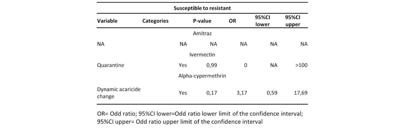 In QV, one variable was significantly associated with resistance to amitraz “new animals” (category “yes”) with an OD 3.50, p-value 0.03. One variable was significantly associated with resistance to ivermectin “pour-on” (category “yes”) with an OD 0.25, p-value 0.04. One variable with resistance to alpha-cypermethrin “use of additional methods” (category “yes”). And two variables were associated with multi-resistance “new animals” (category “yes”) with an OD 6.75, p-value <0.01, and “pour on” (category “yes”) with an OD 0.28, p-value 0.04 (Supplementary Table II).