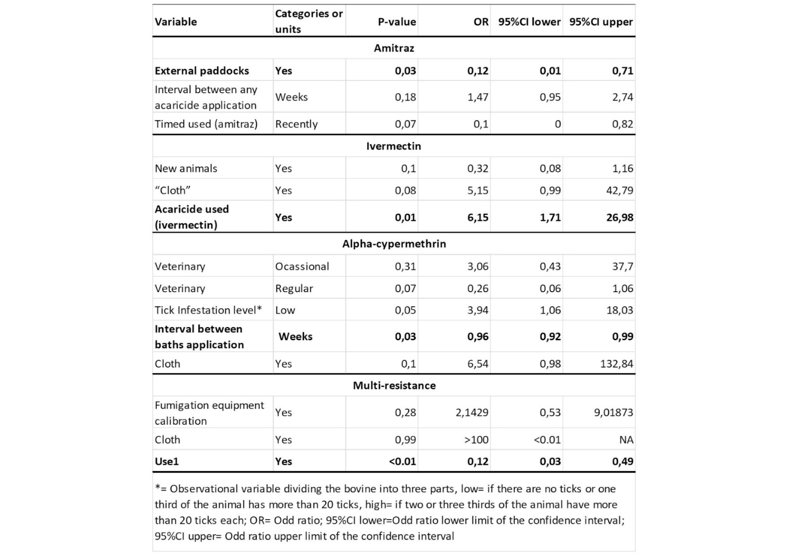 In the case of multi-resistance in QV, the variable "use of pour on" (category "yes") emerged as a protective factor with an Odds Ratio (OR) 0.14. Limited studies have associated multi-resistance to various acaricides with potential risk factors, such as Fernández-Salas et al. (2012) who were unable to determine management factors associated with tick populations resistant to amitraz and cypermethrin on farms. The use of pour-on acaricides emerges as a protective factor. This could be attributed to their different mechanism of action, minimal active ingredient loss due to direct application to animals (thus minimizing environmental dispersion compared to spray baths) and their distinct active ingredients, which contribute to disrupting the cycle of resistant ticks over an extended period.
