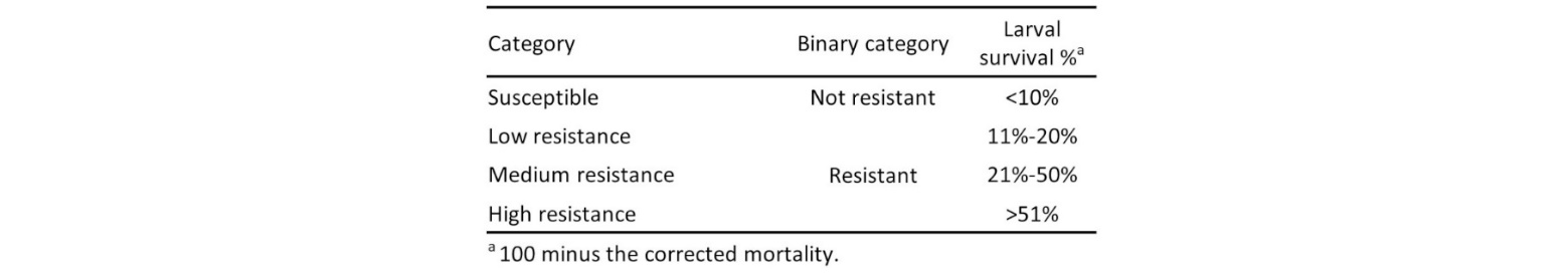 Table. III. Resistance levels in the larval package test used to determine resistance status at the farm level.