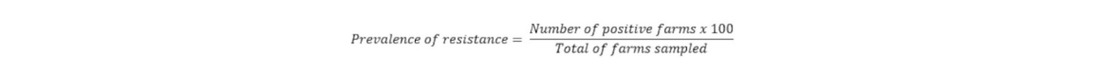 Then, with these results, the percentage of resistant farms was obtained. The resistance status of tick populations was obtained using the discriminatory dose or mean dose for each active principle. To obtain the percentage of resistance, the corrected mortality was subtracted from 100. To calculate the prevalence of farms with resistant tick populations, we used the formula described by Pérez-Otáñez et al. (2023)