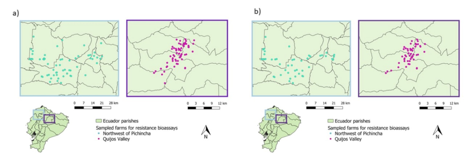 Figure. 1. Sampled farms to determine resistance to acaricides in Northwest of Pichincha and Quijos Valley a) first year 2020 b) second year 2021.