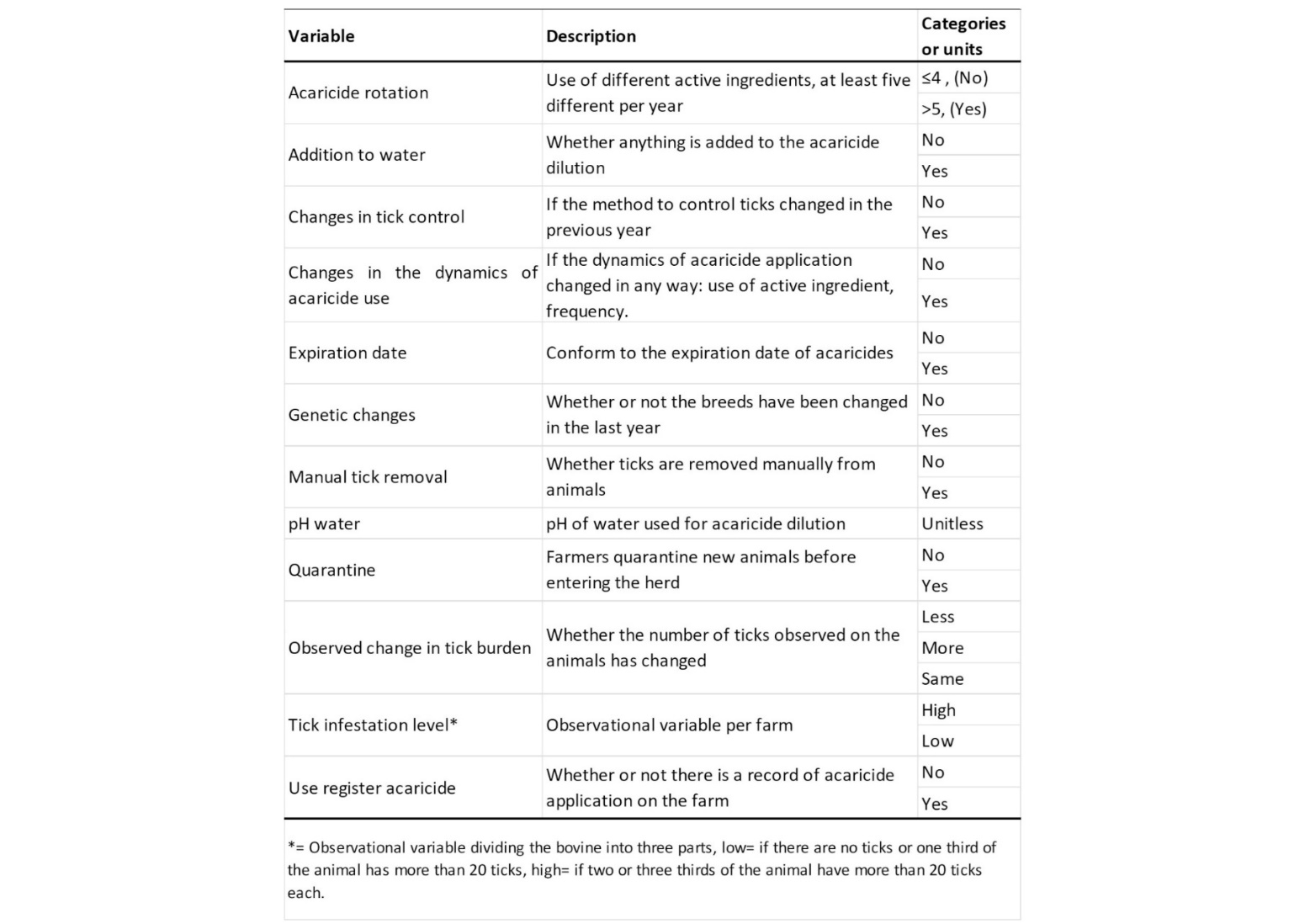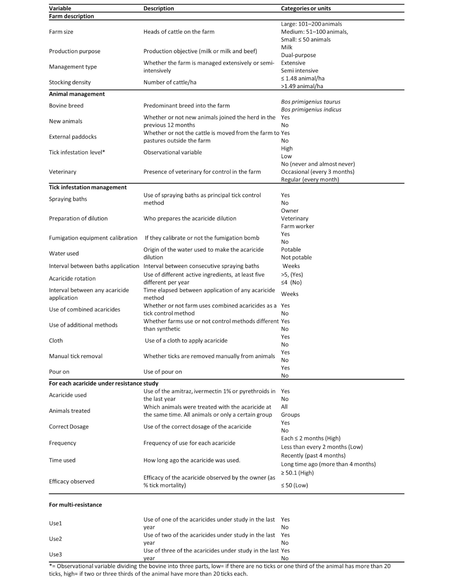 A digital questionnaire was administered to each farm using Epicollect 5 which is a free mobile data collection platform developed by the Centre for Genomic Pathogen Surveillance (version 5.1.52). It enables to create forms and collect data. In the first year, the questions focused on the description of the farm, general management practices, and use of acaricides. The questionnaire also included questions about the farm's situation with regard to cattle ticks. In the second year, a separate questionnaire was used that focused on the changes in management and control of cattle ticks on the farm (Fernández-Salas et al., 2012; Rodriguez-Vivas et al., 2006). Variables collected in year 1 and analysed here are presented in Table I.
