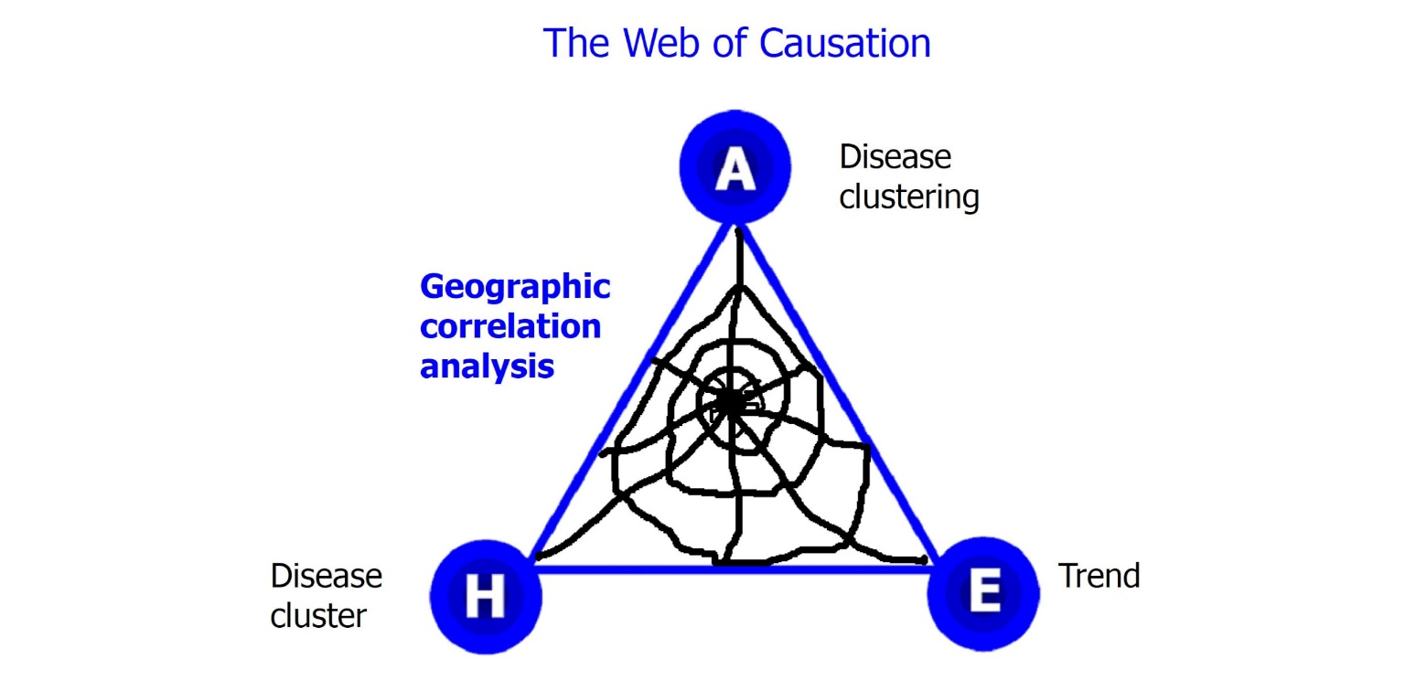 Figure. 2. The geographic epidemiological trillium combined with Charlotte’s web of causation (after Krieger, 1994) as an attempt to visualize the relation between disease cluster, clustering and trend detection via geographic correlation analysis to uncover (causal?) relations among agent, host and environment characteristics.