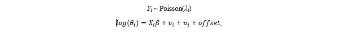 where: Xi β is a linear trend, vi are spatially correlated random effects, and ui are uncorrelated random effects representing extra Poisson variation, and log(Ni) being the offset. The random effects are distributed independent of each other and with an expectation of zero. Briefly, the vi model residual spatial dependence whereas the ui model noise and sporadic outliers. Alternate models and modeling approaches depend on the spatial nature of the data, i.e. whether places are spatially continuous or contiguous leading to geostatistical and conditional autoregressive models. Furthermore, the models require a specification of the distribution of their parameters and respective estimation methods resulting in a variety of frequentist and Bayesian modeling approaches.