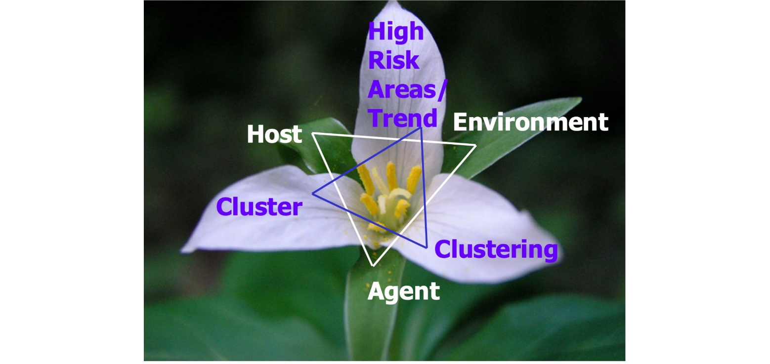 Figure. 1. The geographic epidemiological trillium, representing with its 3 white petals and 3 green petals the link between the epidemiological triangle and the spatial patterns of disease occurrence.