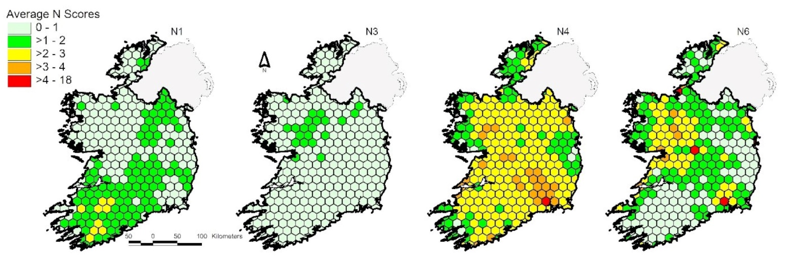 Figure. 10. The average count of Neighbourhoodness Score “N score” relationships between farm fragments for N1, N3, N4 and N6 per 10km hexagon (all values available from the online resource).