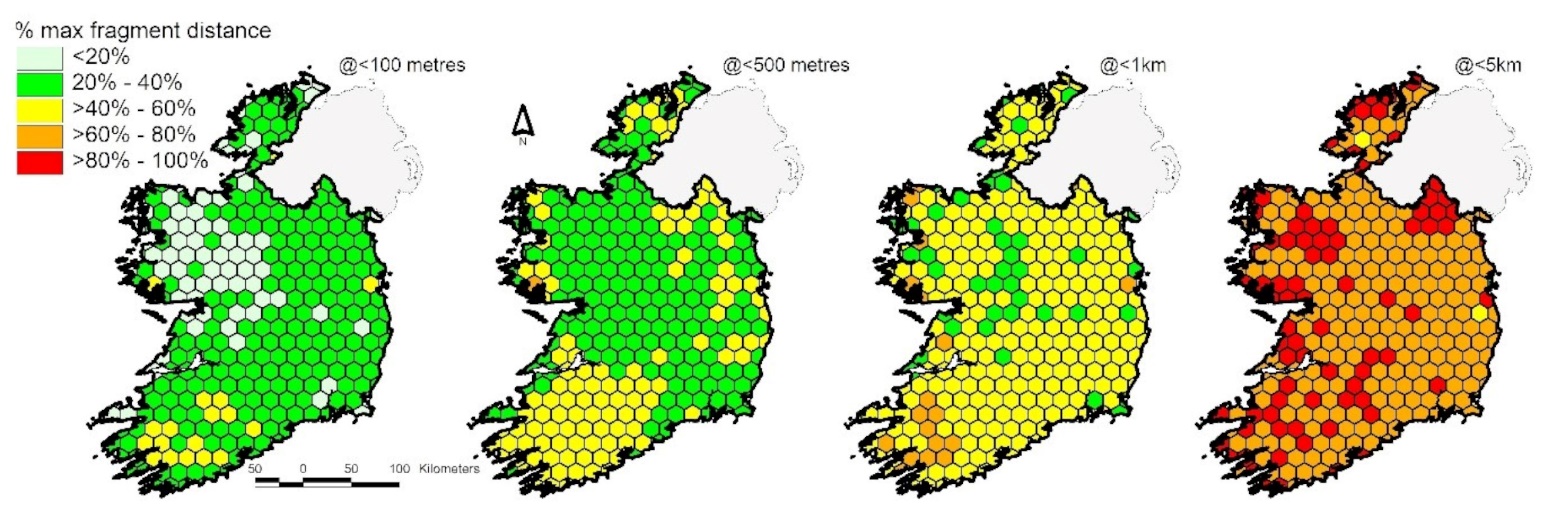 Figure. 6. Percentage of farms by 10km hexagon with an average maximum within farm fragment distance of less than 100 metres, 500 metres, 1km and 5km respectively.