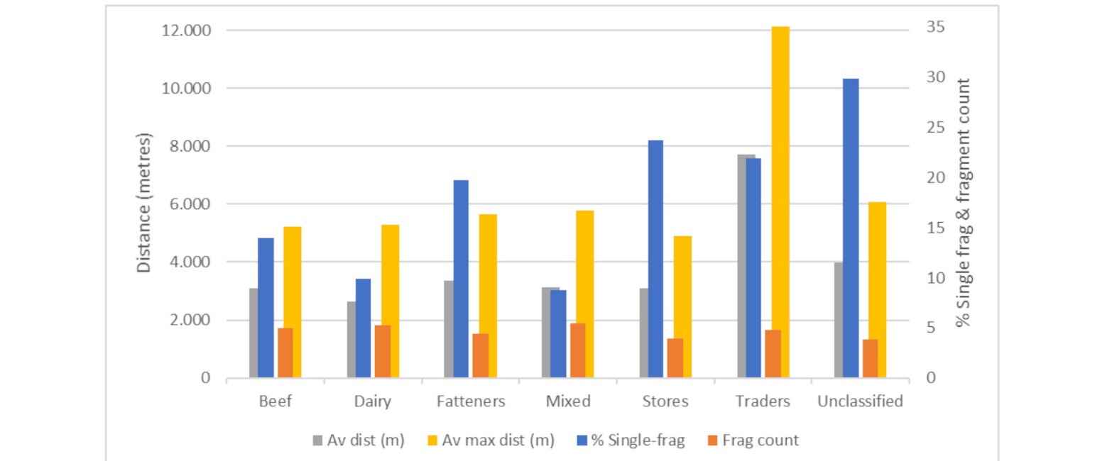 Figure. 7. The fragment count (secondary Y axis), average distance and maximum distance (primary Y Axis) of fragmented farms by enterprise type. Also shown, the percentage of single fragment farms (secondary Y axis) by enterprise type.