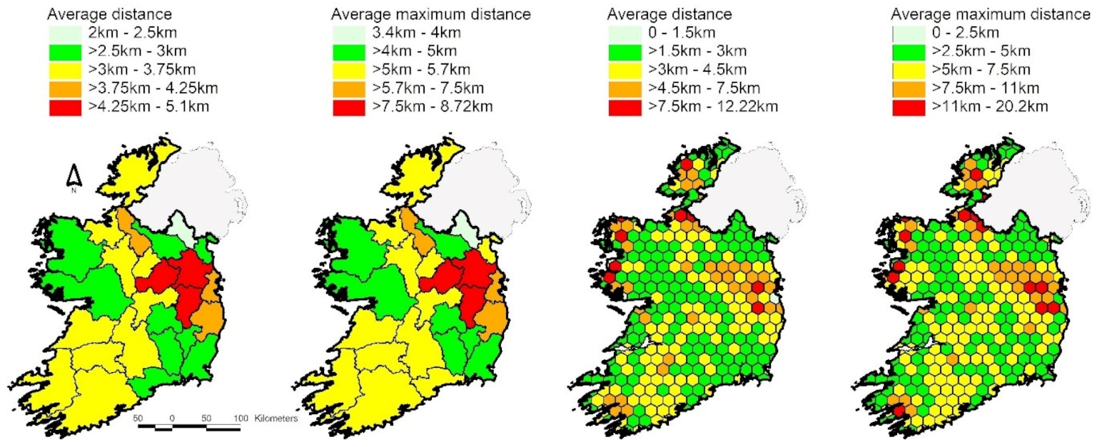 Outputs have been generated in two spatial scales: in hexagonal grid squares and at County level. County level values were generated for administrative and descriptive purposes as a spatial unit known to stakeholders in Ireland. Hexagon output allows for more granular visualisation of the values and allows for higher resolution, equally spatially distributed summary data to be downloaded and explored by third parties.