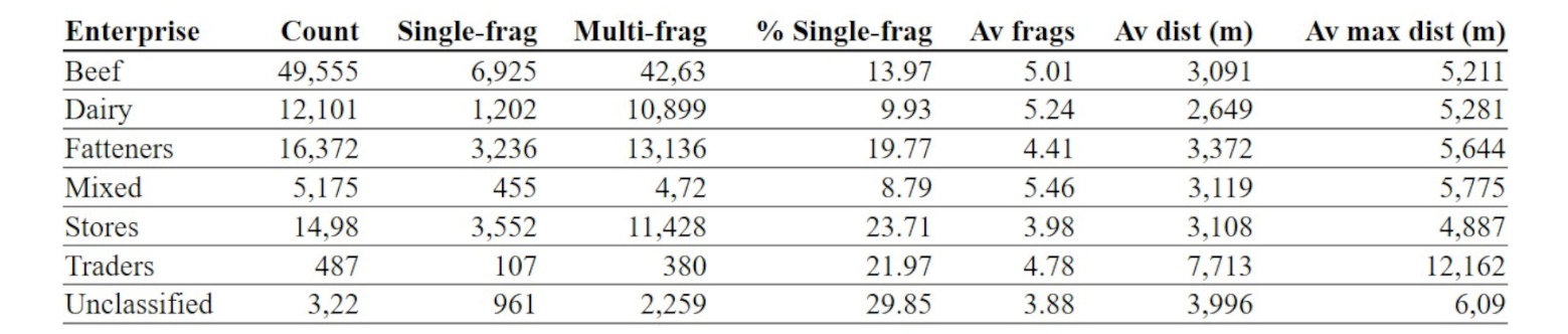 There are many potential uses for the farm fragment distance summaries generated. Depending on an exposure variable, fragment distance thresholds can be set to select for farms that could be considered single spatial units for the purpose of specific analyses. For example, exposure variables such as soil type, temperature or rainfall would be similar over relatively large areas whereas exploring a putative local exposure source, such as a contaminated river, would only be of significance to livestock with direct access. In the case of the first example, herds could be selected with a maximum fragment distance of several kilometres whereas herds in the second example would need to be integrated single fragment farms to give the most robust spatial attribution of livestock. A working example is a study conducted in Ireland to determine heavy metal exposure to cattle through grazing over time (Canty et al., 2014). Farms were selected manually to ensure homebred livestock grazed in a defined local area ensuring exposure related to local soil parameters. With the methodologies presented in this paper, the farm selection process would have been a desktop exercise without the need for manual selection.