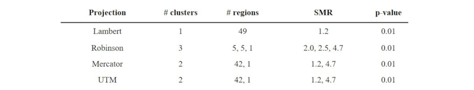 The result from a circular spatial scan test analysis under the four projections is summarized in Figure 3 and Table II. It is a curious result that the number of clusters differs from 1 to 3 for the projections. And more importantly the SMR can be as low as 1.2 or high as 4.7; which might demand public health intervention or the opposite. Additionally, the location and size of potential clusters is more or less specific (Figure 3).