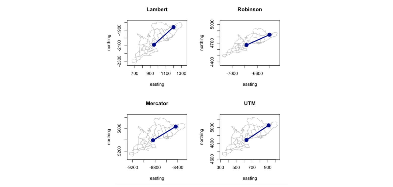 Figure. 2. Maps of Ontario under 4 different map projections. The dots and connecting lines represent the distance and direction between the cities Toronto in the center and Ottawa in the northeast. All coordinates are in km. The euclidean distances by projection from top-left to bottom-right are: Lambert 339km, Robinson 403km, Mercator 470 km, and UTM 336km.