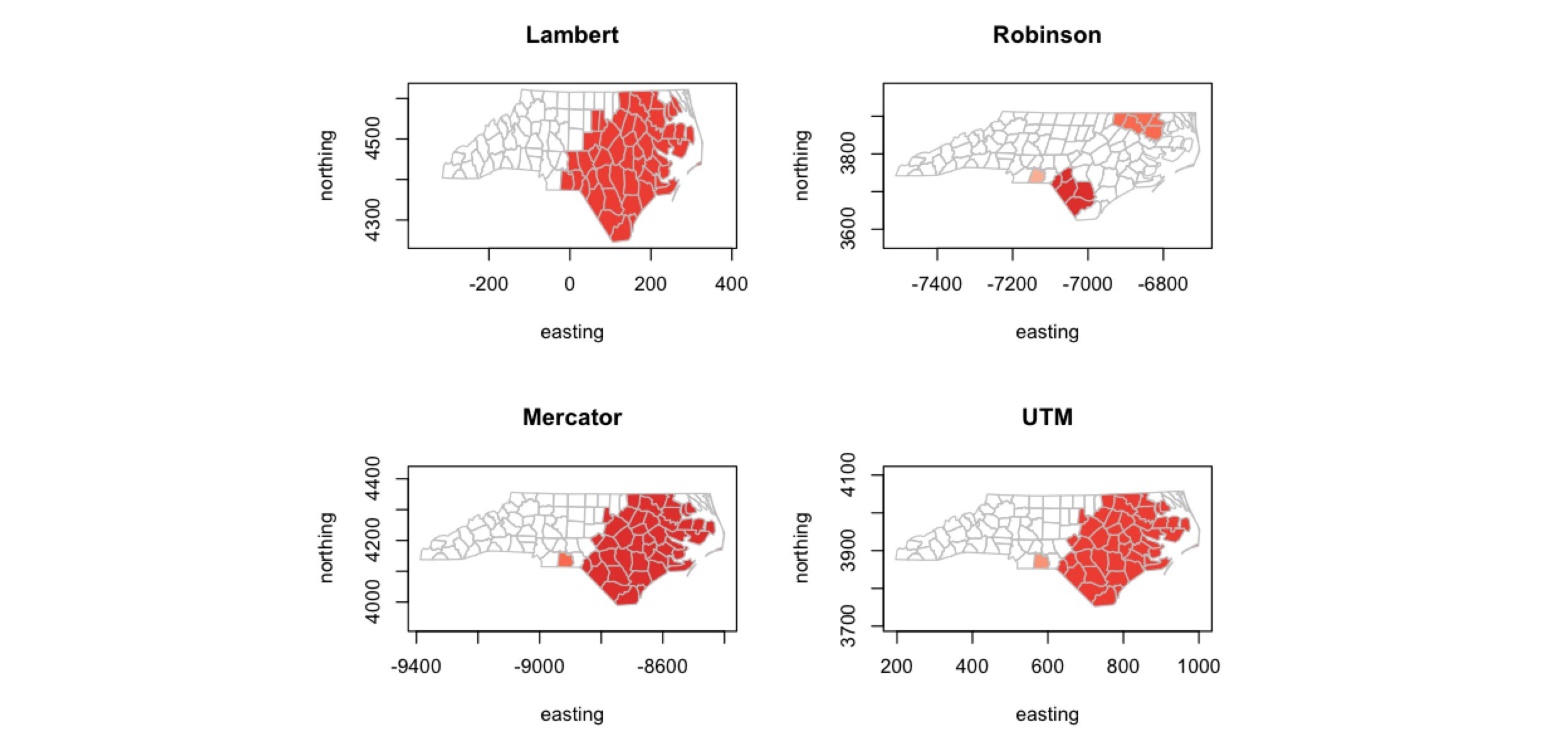 Figure. 3. Maps of North Carolina under 4 different map projections. The coloured counties represent the disease clusters as identified by the spatial scan test at a 5% significance level. All coordinates are in km.