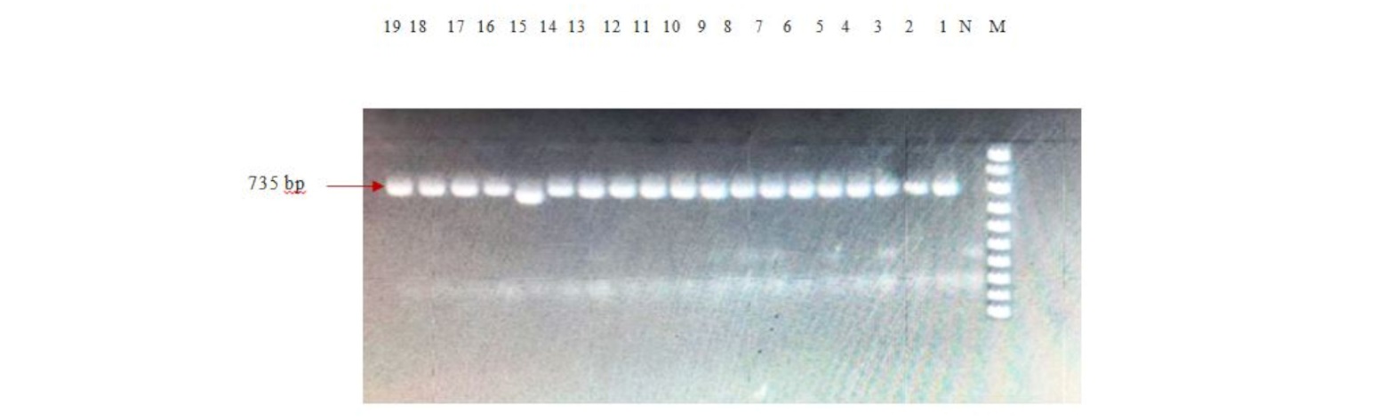 Figure. 4. PCR detection of Campylobacter jejuni; Lane M- Ladder; N- Negative Control; 1- Postive control; 2-19- suspected C. jejuni.
