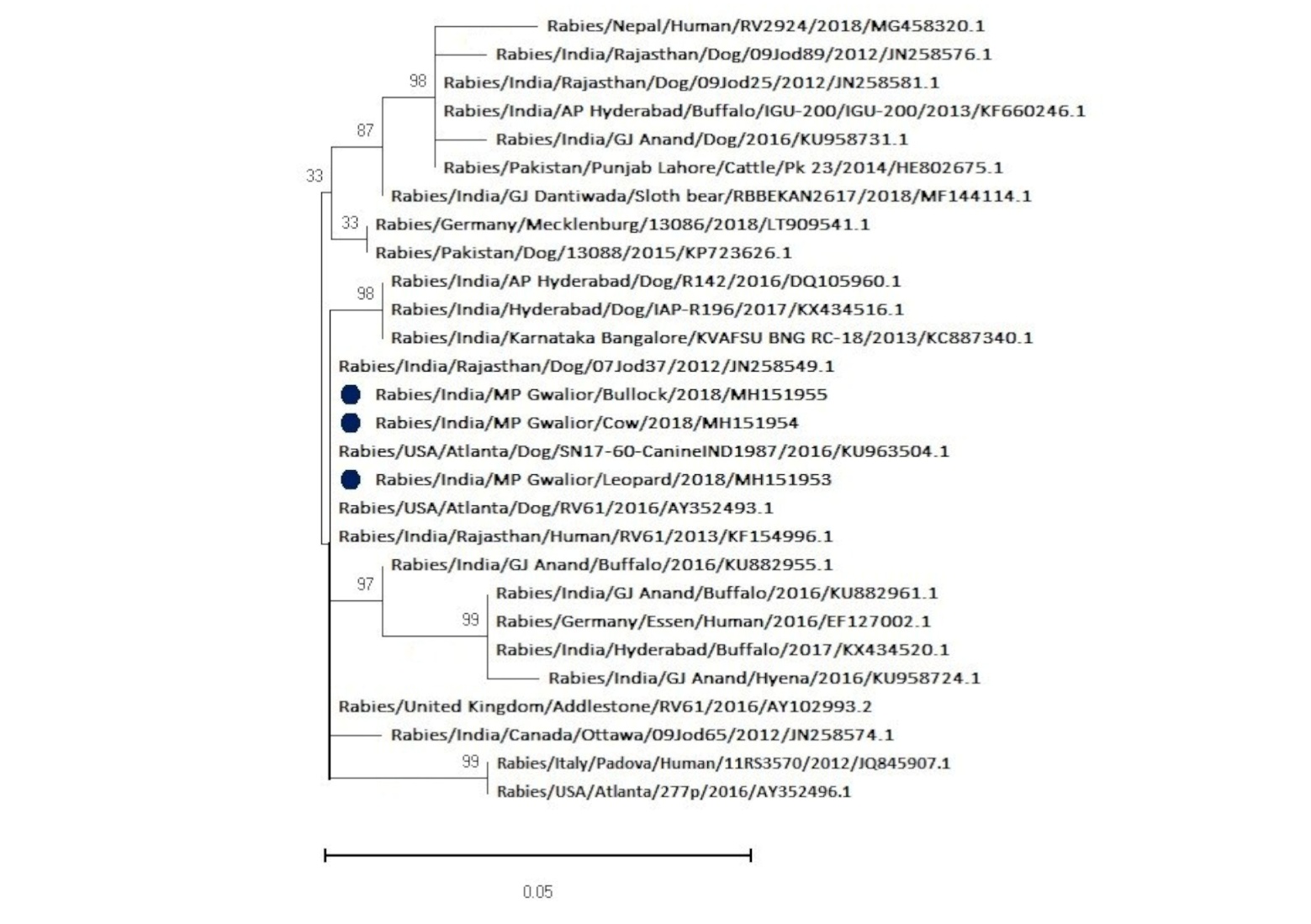 Figure. 3. Phylogenetic tree based on partial N gene sequences of three rabies virus (RABV) isolates (indicated by blue dots). The tree was constructed using PhyML 3.0 with the Maximum Likelihood method and a bootstrap value of 1000, and subsequently refined in M EGA X. These sequences belong to the Arctic-like 1a clade, clustering with other Indian RABV sequences.