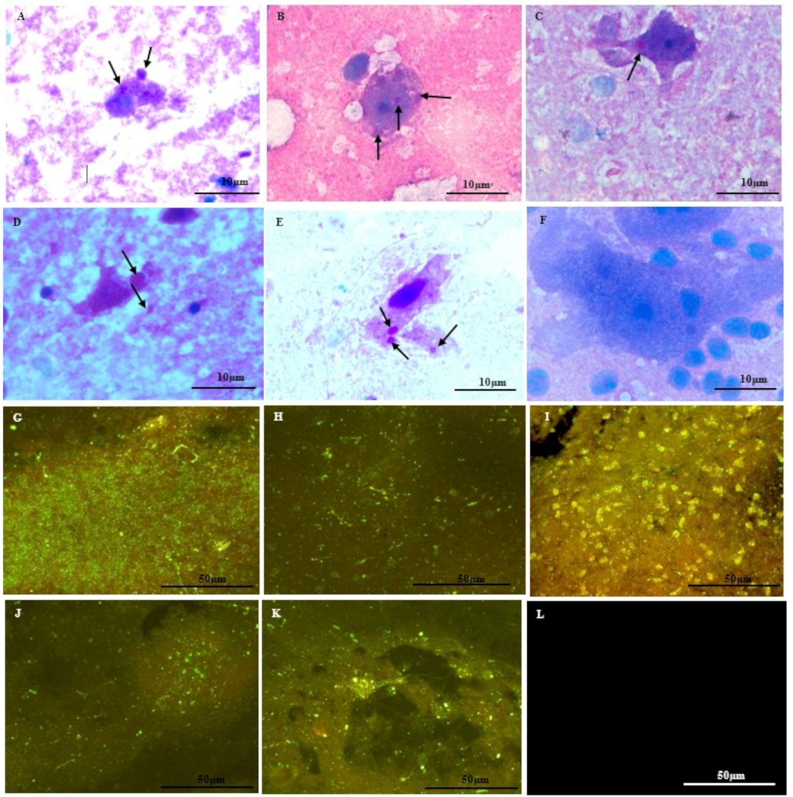 Figure. 1. A–C: Impression smears of brain tissue from a jungle cat, leopard, cow, and bullock showing magenta-coloured intracytoplasmic Negri bodies (arrows), stained with Seller’s stain (×1000). D: Positive control – Impression smear of brain tissue from a dog showing magenta-coloured intracytoplasmic Negri bodies (arrows), Seller’s stain (×1000). E: Negative control – Impression smear of brain tissue from a dog showing no intracytoplasmic inclusion bodies, Seller’s stain (×1000). G–J: Impression smears of brain tissue from a jungle cat, leopard, cow, and bullock showing apple-green fluorescence signals indicating the presence of Negri bodies (arrows), using direct fluorescent antibody test (dFAT) (×400). K: Positive control – Impression smear of brain tissue from a dog showing apple-green fluorescence signals, dFAT (×400). L: Negative control – Impression smear of brain tissue from a dog showing no fluorescence signals, dFAT (×400).