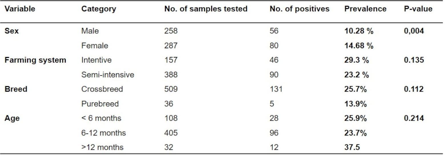 Associations between categorical variables (e.g., age, sex, breed, housing system, region) and BVDV seropositivity were assessed using the Pearson chi-square test. A p-value of less than 0.05 was considered statistically significant. The statistical results were summarized and presented in tabular form.