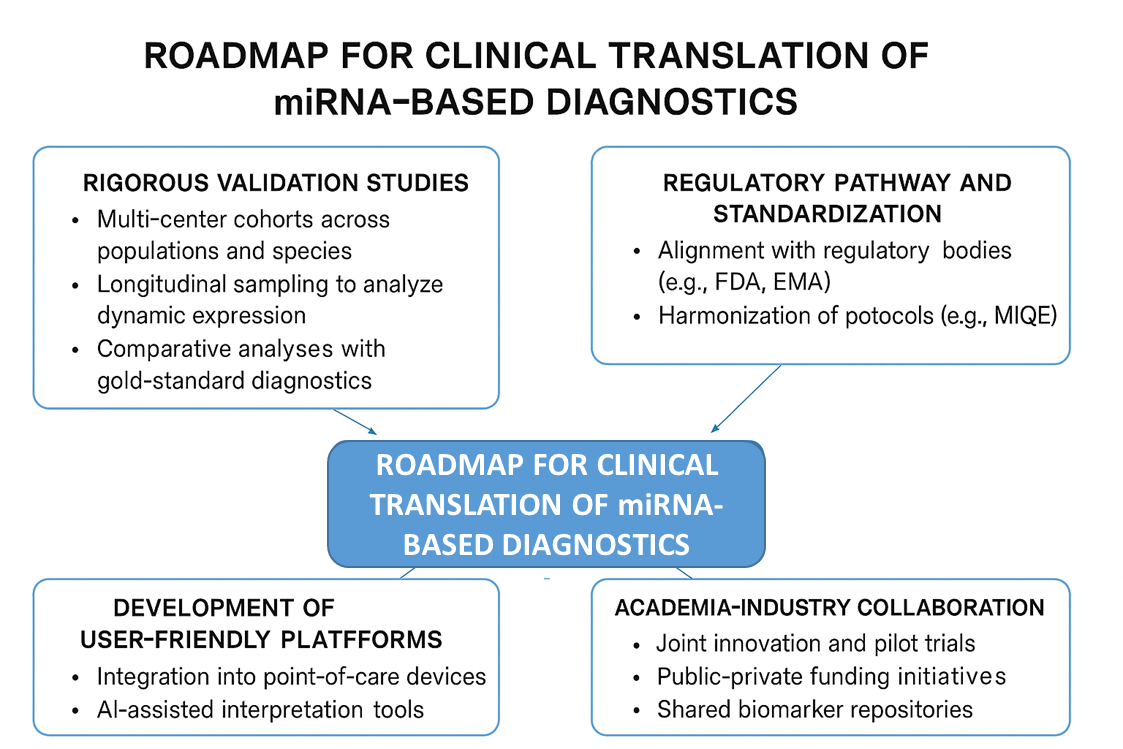 To achieve reliable inter-laboratory reproducibility and facilitate the clinical adoption of miRNA-based diagnostics, it is essential to establish harmonized operational protocols across laboratories. Standardization should begin with consistent sample collection procedures, including the use of EDTA-coated or serum-separating tubes, immediate centrifugation at 2,000 × g for 10 minutes at 4°C, and prompt storage of samples at −80°C to preserve RNA integrity. RNA extraction protocols must be unified using validated commercial kits with high miRNA recovery efficiency and the routine inclusion of synthetic spike-in controls, such as C. elegans miR-39, to monitor extraction quality (Sewer et al., 2014). For qRT-PCR assays, normalization strategies should rely on consensus endogenous controls like miR-16 or miR-191, selected based on low variability and expression stability, and evaluated using algorithms such as geNorm or NormFinder (Gupta et al., 2021; Hays et al., 2022). Calibration across platforms—qRT-PCR, NGS, and digital PCR—should involve the use of synthetic miRNA standards or reference curves to ensure quantification accuracy (Hays et al., 2022). Furthermore, data analysis should follow the MIQE (Minimum Information for Publication of Quantitative Real-Time PCR Experiments) guidelines (Johnson et al., 2014), while metadata reporting can be standardized using MIMARKS criteria. To identify and minimize technical variability between laboratories, proficiency testing and ring trials should be implemented routinely. These measures will collectively reduce pre-analytical and analytical bias, enhancing the robustness, reproducibility, and translational utility of miRNA biomarkers in veterinary diagnostics (Gupta et al., 2021; Hays et al., 2022).