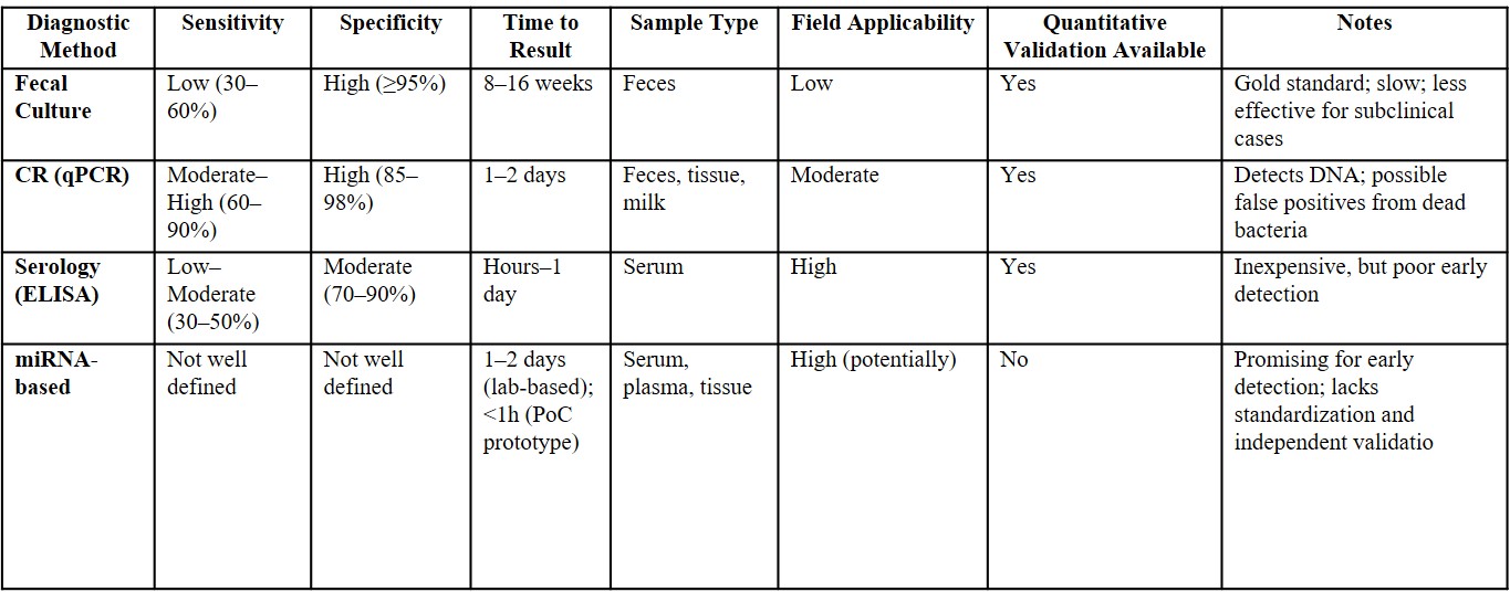 Early identification of infectious diseases is often crucial for controlling its spread and improving the prognosis of the animal. As the condition worsens, treatment options often become increasingly limited (Gupta et al., 2018). In MAP infection, early intervention of disease is crucial because animals with infection may remain asymptomatic for two to five years (Tribolet et al., 2020). Diagnosis of Johne's disease is usually done by fecal culture, but the technique is labor-intensive and of low sensitivity (Sharma et al., 2020). PCR detection is the most accurate because it can detect subclinical and clinical animals that are shedding MAP (Giese et al., 2000). PCR is more sensitive and specific than fecal culture for detecting MAP and, unlike immune-based assays, is not dependent on either Th1/IFN-γ or Th2/antibody responses (Begg et al., 2011; Chaitanya et al., 2022). Jain et al., (2021), when compared rELISA to fecal PCR it found more sensitive and specific than fecal PCR. As a result, it can be regarded as a useful tool for diagnosing paratuberculosis, overcoming the drawbacks of current techniques, and opening the door to improved disease treatment in cattle. Metcalf, (2024), explains the promising role of microRNAs (miRNAs) play as circulating biomarkers for early identification of hard-to-detect malignancies (Metcalf et al., 2024). This emphasizes how sensitive and precise diagnostic signatures can be obtained using miRNAs. In comparison to traditional diagnosis methods for Mycobacterium avium subspecies paratuberculosis (MAP) like culture and PCR, miRNA-based diagnosis has a number of clear advantages and future promise. Culture, though regarded as the reference standard, is notoriously time-consuming-taking anywhere up to 16 weeks to generate a result-and is low in sensitivity, particularly in subclinical infections. PCR-based approaches, as faster, also have the limitations of picking up DNA from viable and dead organisms, making for false-positive problems and the need for quality DNA and facilities. In comparison, miRNA biomarkers that remain stable in the body fluids and are recoverable through non-invasive means are capable of presenting early host-pathogen interaction as well as immunity, making detection potentially possible sooner Table 1. In addition, recent developments in portable qPCR platforms and point-of-care technologies have increased the viability of using miRNA-based assays in field settings (Choi et al., 2021; Gao et al., 2025). With initial setup costs possibly being higher, however, once validated, these procedures might provide scalable, multiplexed, and high-throughput diagnostics with little sample preparation, constituting an appealing alternative for MAP detection in clinical as well as herd-level screening programs.