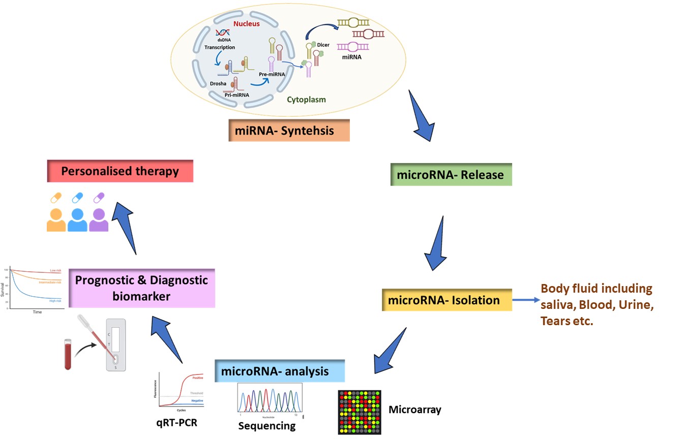 Figure. 1. Diagrammatic representation of miRNA biogenesis and ways of secretion into bodily fluids. In the future, the condition can be targeted and treated individually using a clinical decision-making technique.