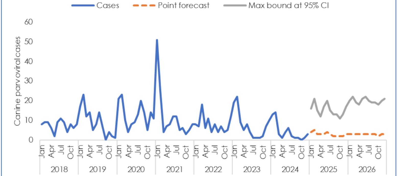 The ARIMA model developed in this study proved effective in capturing trends and generating a 24-month forecast of CPE incidence in Ibadan, illustrating its utility as a decision-support tool. Such forecasting can enable veterinary clinics, public health authorities, and dog breeders to anticipate outbreaks and allocate resources for preventive measures such as vaccination, early treatment, and public awareness campaigns. In contexts like Nigeria, where economic constraints affect veterinary service delivery, predictive tools such as ARIMA offer a cost-effective approach to disease control planning. Similar methods have been applied successfully in human infectious disease surveillance and response (Singh et al., 2021). However, several limitations should be acknowledged. As shown in the comparison between predicted and actual CPE incidence for 2024 (Table I), the ARIMA model more accurately captured the trend than the absolute values, particularly underestimating incidence in the early months. This suggests that actual peak values may exceed forecasted levels. Furthermore, the dataset was derived solely from government veterinary hospitals, which may not fully represent the broader canine population in Ibadan. Consequently, the forecasted incidence should be interpreted as applicable to a subset of the city's dog population. Nevertheless, the model remains valuable for identifying seasonal patterns, which are particularly relevant for decisions such as the timing of puppy acquisition and vaccination by breeders.