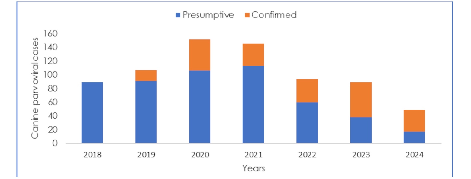 A total of 726 canine parvoviral enteritis (CPE) cases were included in this study, comprising 202 confirmed cases and 524 presumptive cases. The overall incidence of CPE (both confirmed and presumptive) across the three selected veterinary clinics in Ibadan showed a marked increase from 2018 to 2020, followed by a continuous decline thereafter (Figure 1).