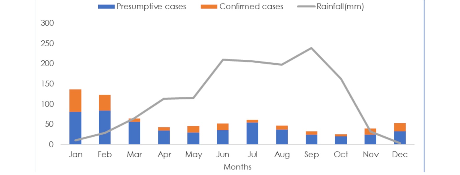 Average monthly rainfall data for Ibadan were obtained from an open-access online repository (https://www.worldweatheronline.com/ibadan-weather-averages/oyo/ng.aspx, accessed January 4, 2025) and used to compare the city’s historical weather patterns with CPE case incidence. The relationship was evaluated using Spearman’s rank correlation analysis.
