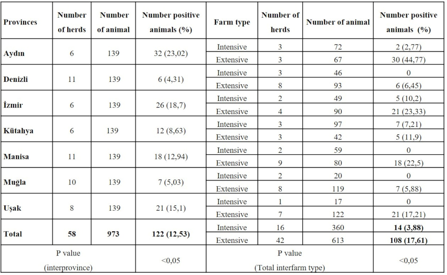 According to the results of the serological analysis, anti-Neospora caninum antibodies were detected in 122 of the 973 cattle tested, corresponding to a seroprevalence of 12.53%. Seropositive animals were found in 32 of the 58 sampled cattle farms (55.17%). Statistically significant differences were observed by province and farm type; detailed results are presented in Table I.