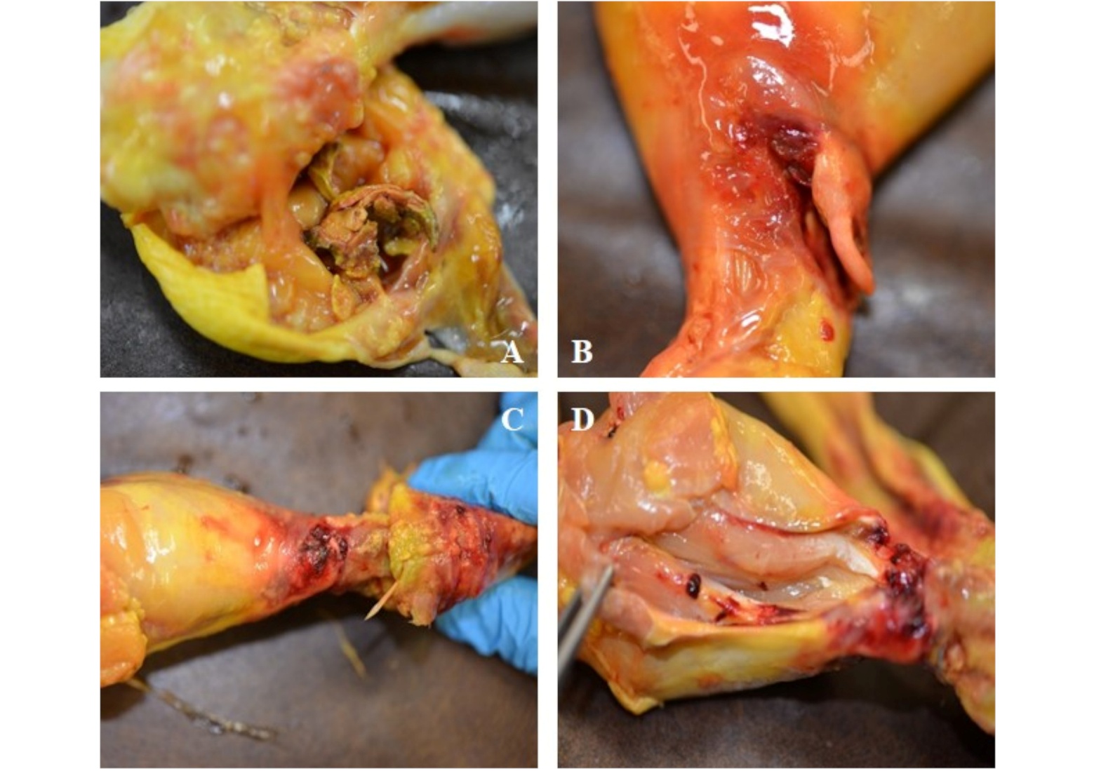 Figure. 5. A) necrosis of the subcutaneous tissue and hock joint; B) subcutaneous haemorrhages and edema that infiltrate the superficial muscles while sparing the tendon, C) subcutaneous and muscular haemorrhagic infiltration and dry heterophilic exudation affecting the subcutaneous tissue; D) peritendinous haemorrhages and edema that apparently do not involve the tendon.