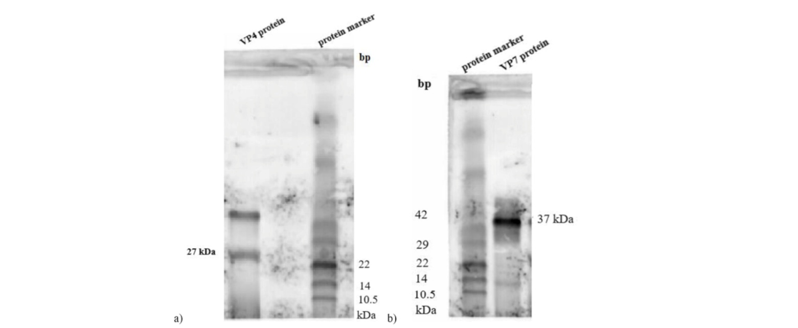 Figure. 7. Western blot imaging. a) Visualization of VP4 protein at approximately 27 kDA molecular weight. b) Visualization of VP7 protein at approximately 37 kDA molecular weight.
