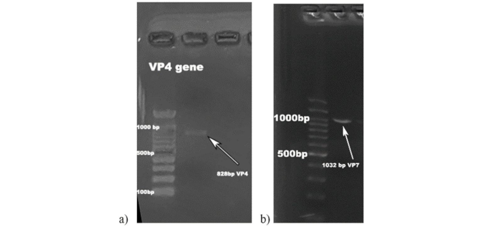 Figure. 4. Visualization on agarose gel after RT-PCR results. a) VP4 gene 828bp, b) VP7 gene 1032 bp.