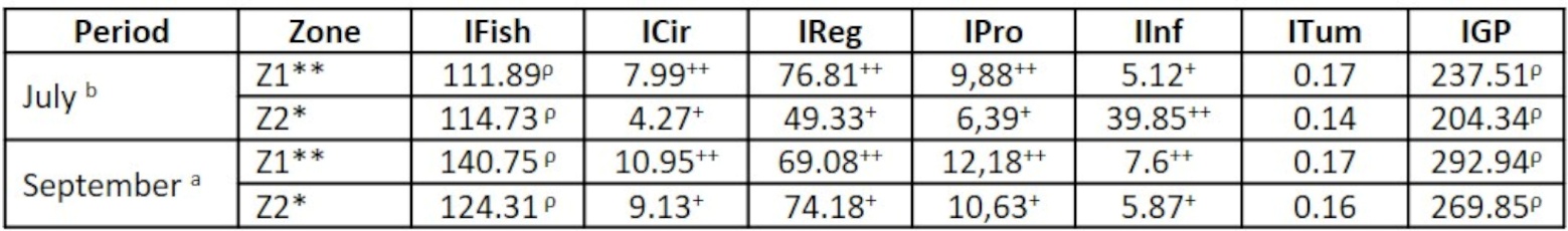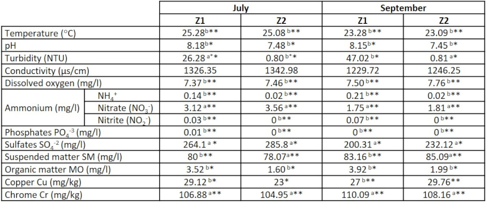 Water quality parameters are presented in Table I. Apart from temporal fluctuations, these parameters revealed certain stability between the two sites for some parameters, while others showed significant differences. Overall, the most polluted water occurs in Z1 during September (IGP: 292.94).