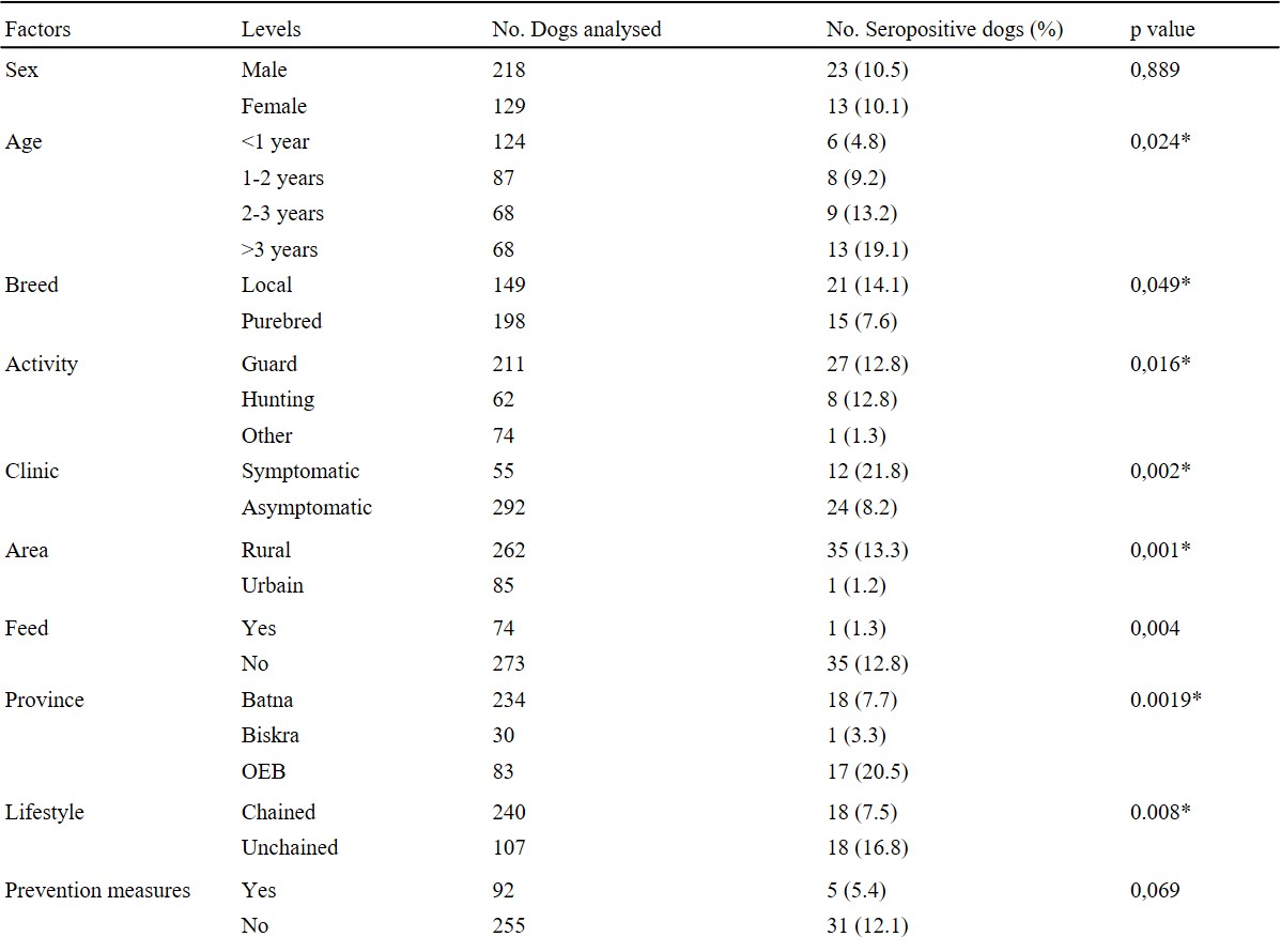 Table. IV. Seroprevalence of canine leishmaniasis in relation to different variables using the Chi-square test. *The result is significant for Chi-square test at p ≤ 0.05.