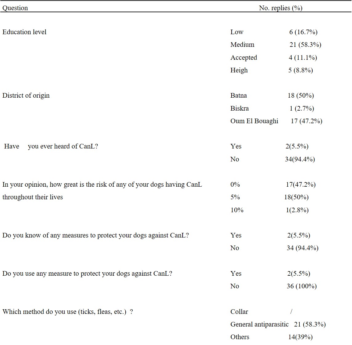 In our survey, Batna was found to be home to 50% of the positive dog owners questioned, which corresponds to 18 out of 36 total respondents. Oum El Bouaghi had 47.2% of the positive dog owners, translating to 17 out of 36 respondents. Biskra was notably lower, with only 2.7% represented, accounting for just one out of 36 respondents. Additionally, the majority of those surveyed had a medium level of education (58%). A significant majority, specifically 34 out of 36 owners (94.4%), displayed no previous knowledge about Canine Leishmaniasis (CanL). Despite this, 58.3% of them reported using general antiparasitic products to safeguard their dogs from other types of arthropods.