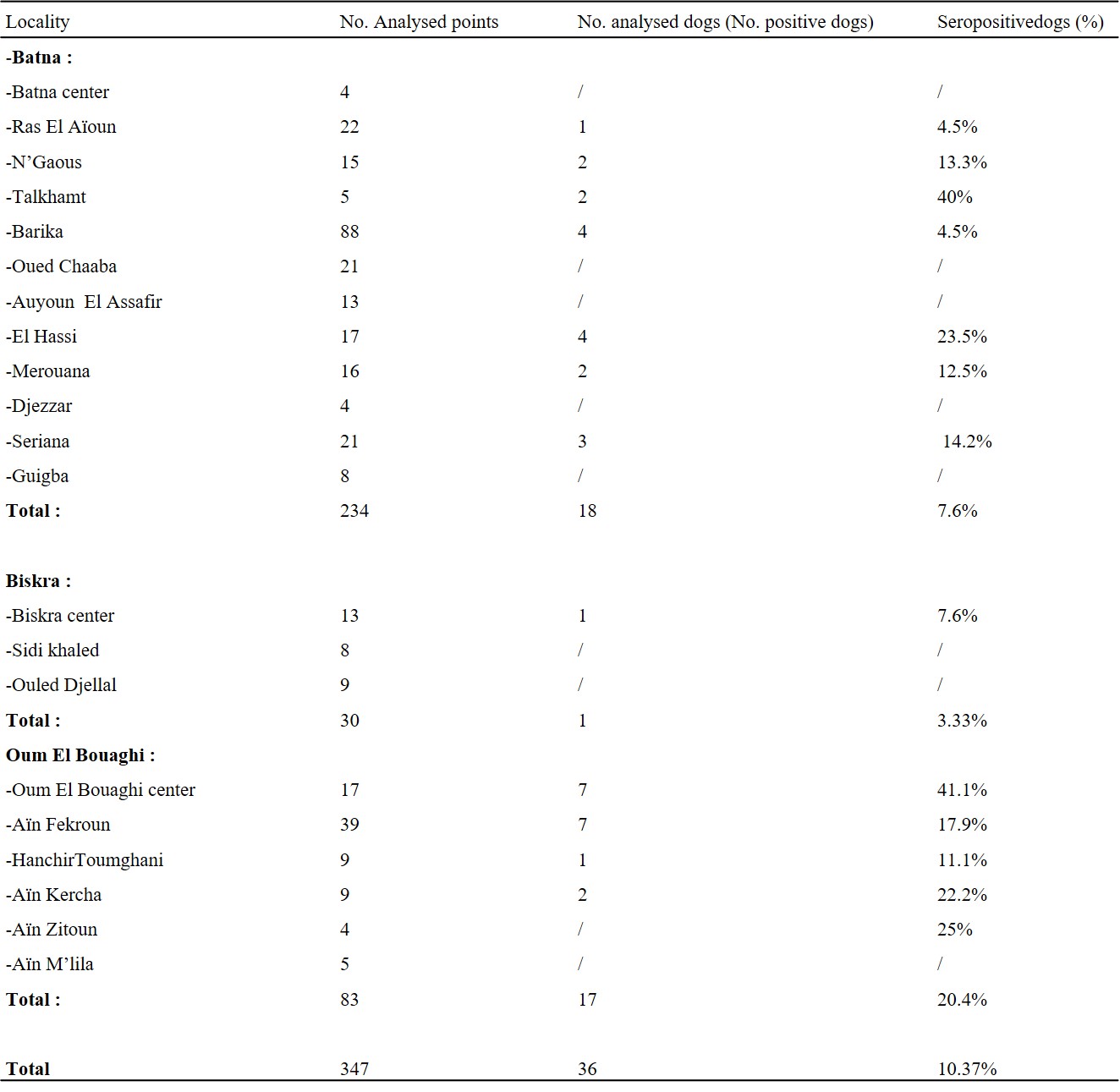 Among the 347 dogs analysed, 10.37% (36 dogs) tested seropositive by ELISA. In Batna, the prevalence reached 50% with 18 positive cases, while in Oum El Bouaghi it was 47.22%. In contrast, Biskra showed a much lower prevalence of 2.8%, with only one positive case detected. By region, 18 out of 234 dogs (7.6%) were positive in Batna, 17 out of 83 dogs (20.4%) in Oum El Bouaghi and 1 out of 30 dogs (3.33%) in Biskra (Table II).